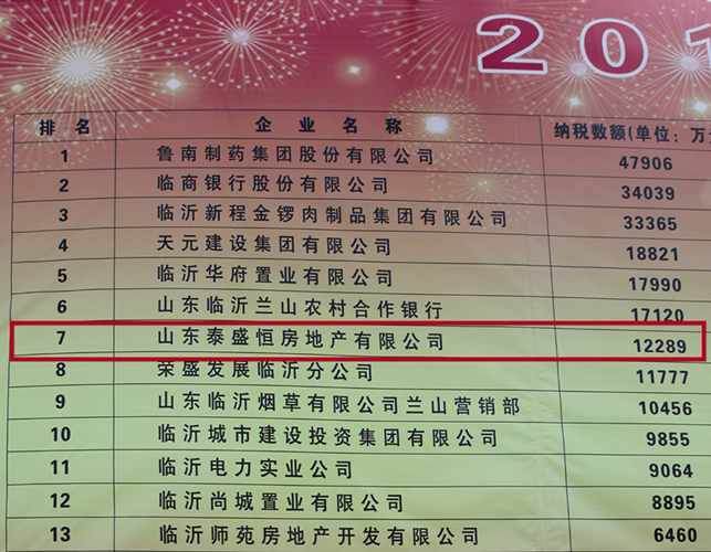 近日,從蘭山區(qū)統(tǒng)計(jì)局公布的統(tǒng)計(jì)數(shù)據(jù)顯示,山東泰盛恒房地產(chǎn)有限公司以12289萬元的納稅額榮登蘭山區(qū)2014年度納稅千萬以上企業(yè)第7名。
