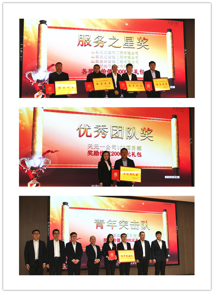 隨后,會議公布了榮獲2019年度服務之星(山東天元裝飾工程有限公司、山東天元安裝工程有限公司、山東全興安裝工程有限公司、臨沂均平門業(yè)有限公司)、優(yōu)秀團隊獎(天元一公司102項目部)、青年突擊隊獎(金泰瑞府項目)的獲獎單位及項目,并進行現(xiàn)場頒獎。